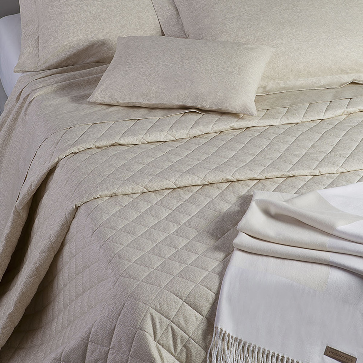Il Copriletto Trapuntato OPLÀ Borbonese in percalle di puro cotone 200 T.C. è la scelta ideale per chi desidera unire eleganza e comfort nella propria camera da letto. Realizzato con la qualità artigianale di Tessitura Randi e l’iconico design Borbonese, questo copriletto presenta l’elegante motivo “OP” Occhio di Pernice, che ne arricchisce l’estetica con un tocco di raffinatezza senza tempo. La trapuntatura a rombi, eseguita in continuo e rifinita a mano, aggiunge un dettaglio distintivo, mentre l’orlo sbieco e gli angoli stondati completano l’insieme con un design armonioso.